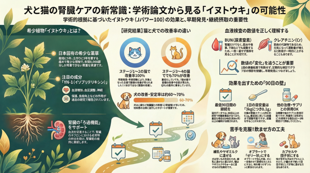 本報告の核心は、日本固有の植物である「イヌトウキ(日本山人参)」が、犬および猫の慢性腎臓病(CKD)における腎機能指標(BUN、クレアチニン)の改善に寄与する可能性を、学術的根拠(エビデンス)に基づいて提示した点にある。